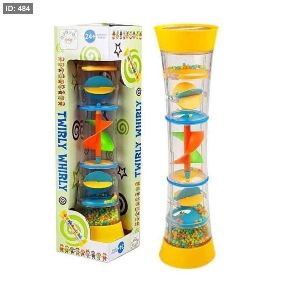 لعبة حسية للأطفال تسمى "Twirly Whirly". تتميز هذه اللعبة بتصميم حلزوني مملوء بخرز ملون يصدر صوتًا يشبه صوت المطر عند قلبها، مما يوفر تحفيزًا سمعيًا وبصريًا.