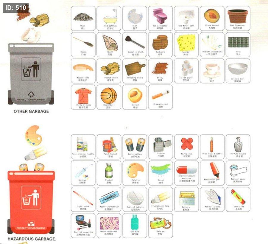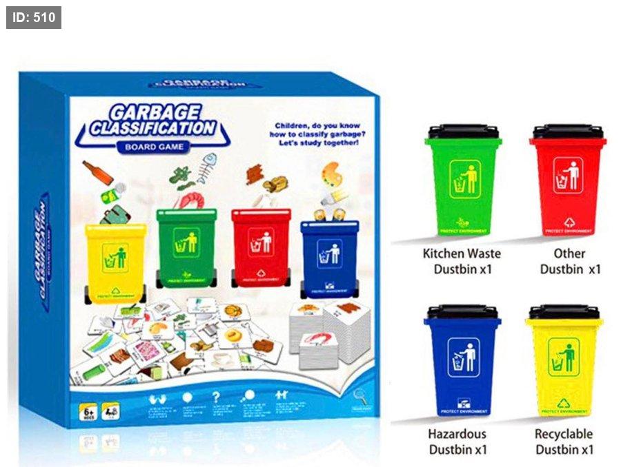 محتويات اللعبة: تتضمن المجموعة عادة أربع سلات مهملات ملونة (للمواد القابلة لإعادة التدوير والمواد العضوية وغيرها) ومجموعة من البطاقات (قد يصل عددها إلى 100) عليها صور لمختلف أنواع القمامة.