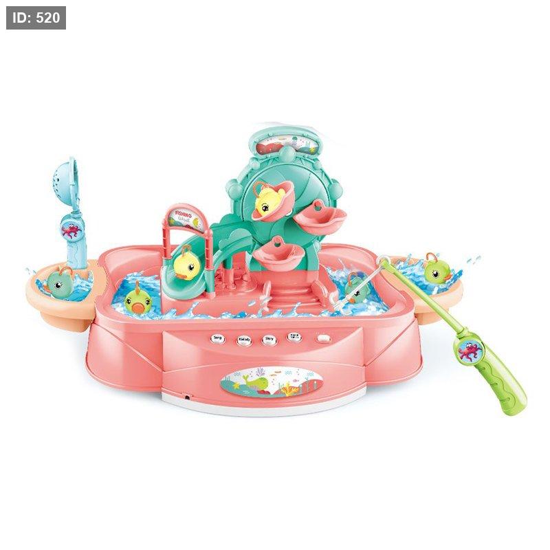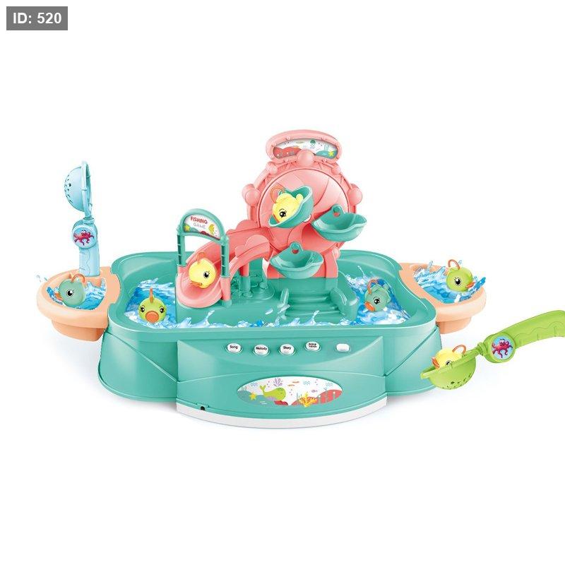المحتوى: تحتوي على أسماك صغيرة وزلاجة يمكن للأسماك أو البط الصغير أن ينزلق عليها، بالإضافة إلى صنارات صيد.