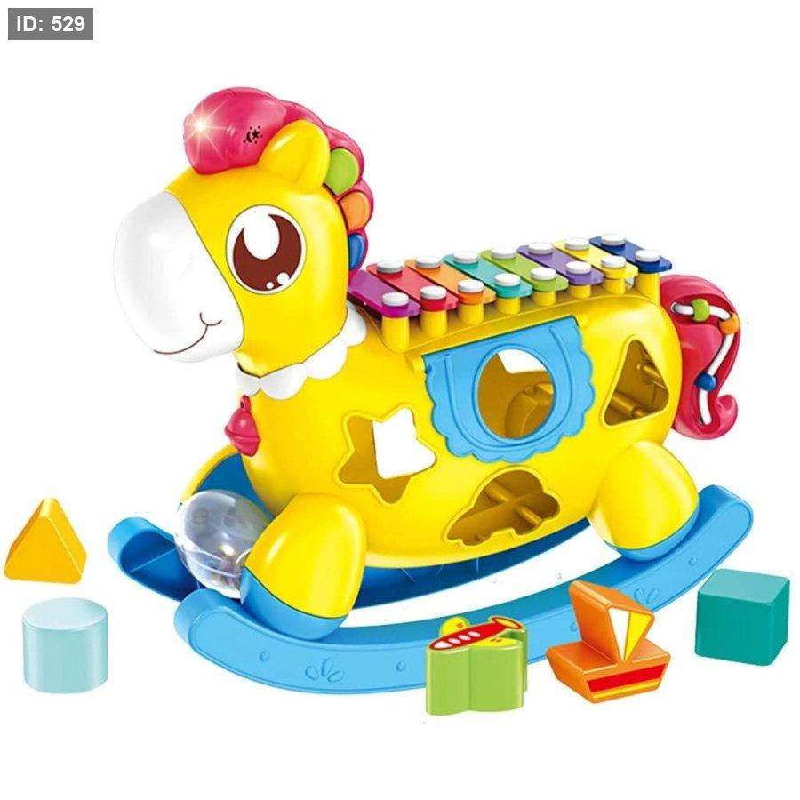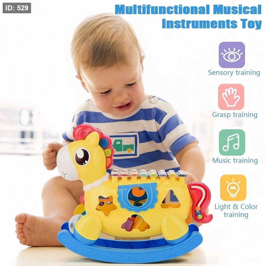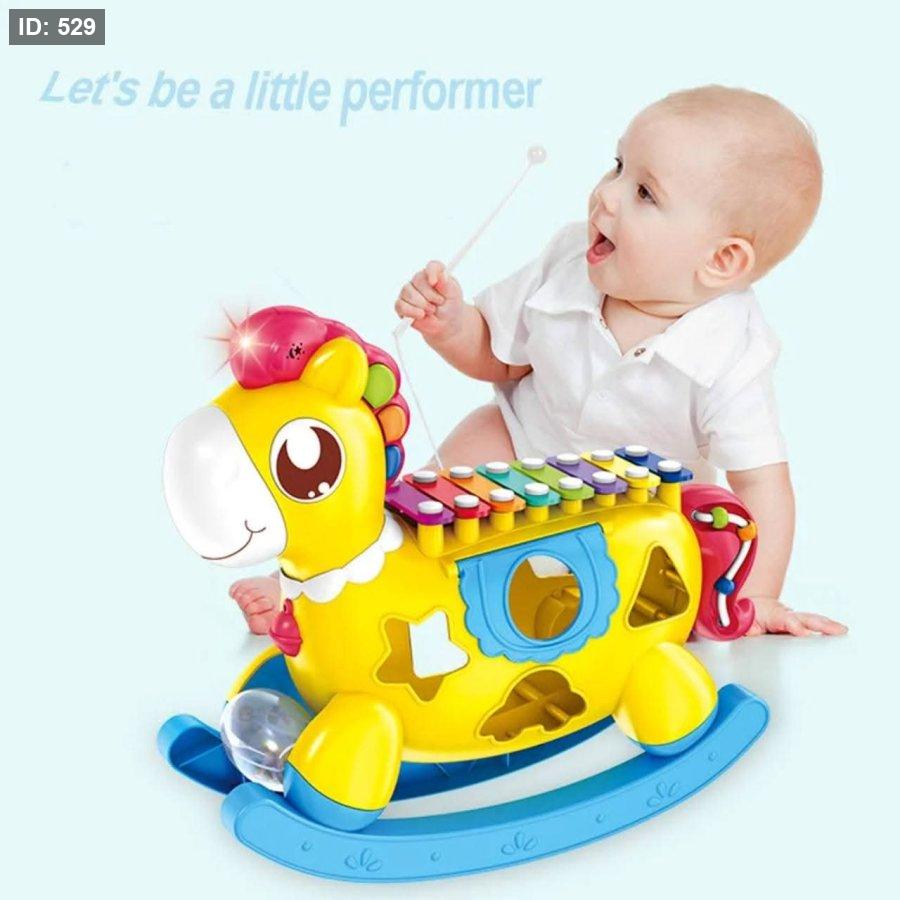 تصميم جذاب: تتميز اللعبة بتصميم حصان هزاز باللون الأصفر مع مفاتيح بيانو ملونة وأضواء لجذب انتباه الطفل.