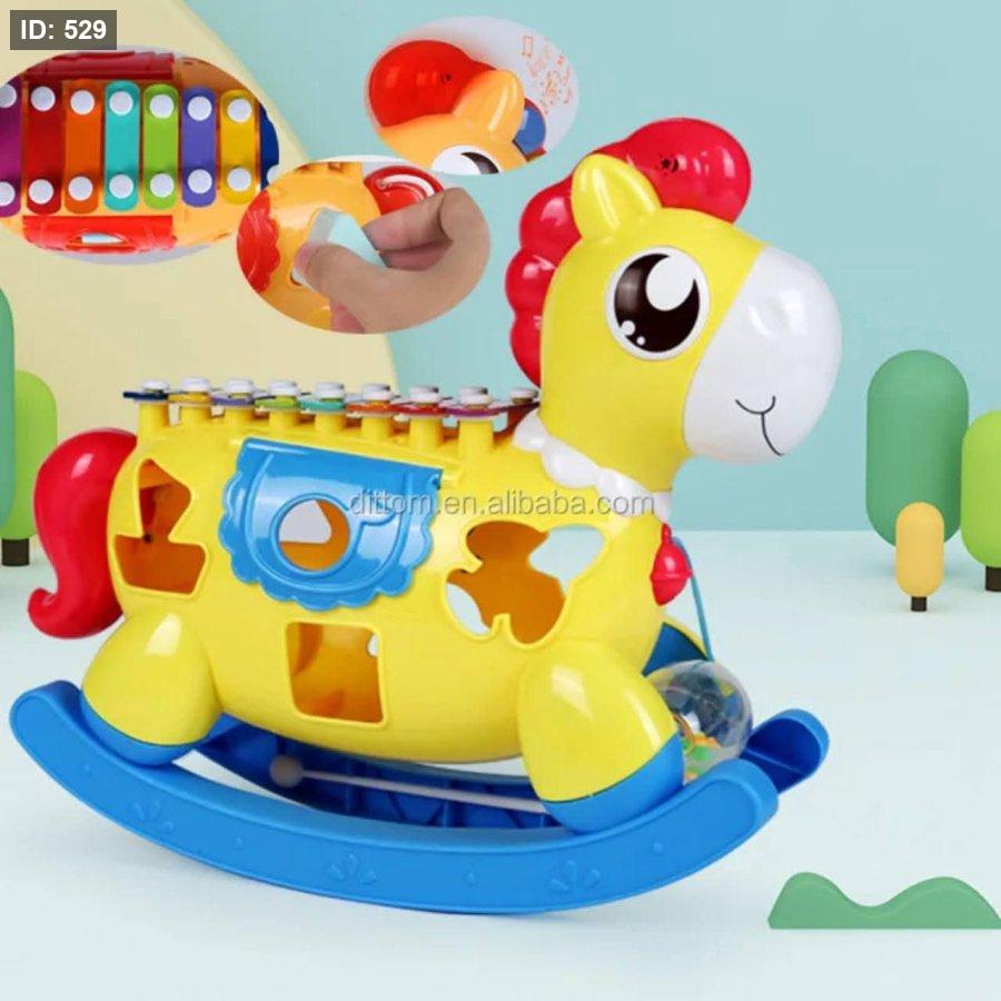 وظائف موسيقية: تحتوي اللعبة على إكسيليفون مدمج يمكن العزف عليه باستخدام المضرب المرفق، وأزرار تشغل ألحانًا وأصواتًا مختلفة للنقل وأصوات المهر، مما يساعد على تطوير الحس السمعي والموسيقي لدى الطفل.