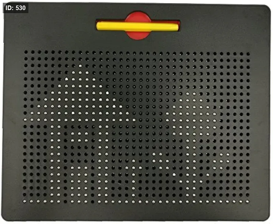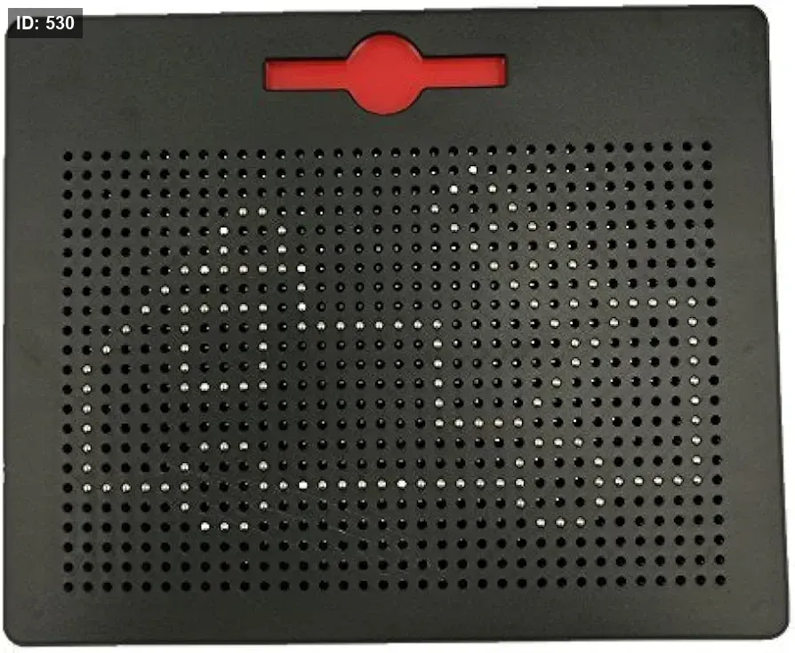 الاستخدام: يتم إنشاء الرسومات عن طريق تمرير القلم المغناطيسي فوق الفتحات، مما يجعل الكرات تظهر على السطح. لمسح اللوحة، يمكن تمرير اليد أو جانب القلم فوق الكرات لإعادتها إلى الداخل. الكرات محتجزة داخل اللوحة ولا يمكن أن تسقط.