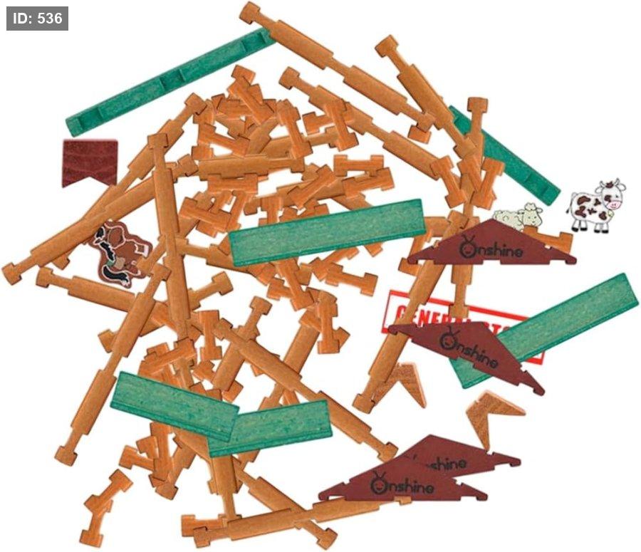 لمجموعة ألعاب بناء خشبية تحمل اسم Onshine. العبوة باللون الأبيض والأحمر والأخضر، وتُظهر صورة لطفل يلعب بالمجموعة، التي تتضمن مبنيين خشبيين بسقف أخضر، وحيوانات مزرعة صغيرة، وعلامة "GENERAL STORE".