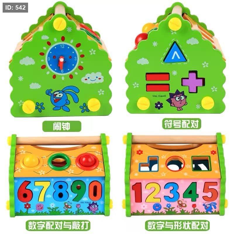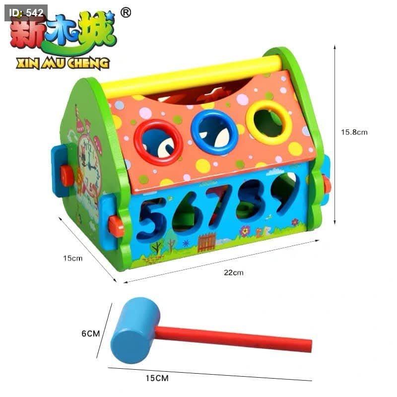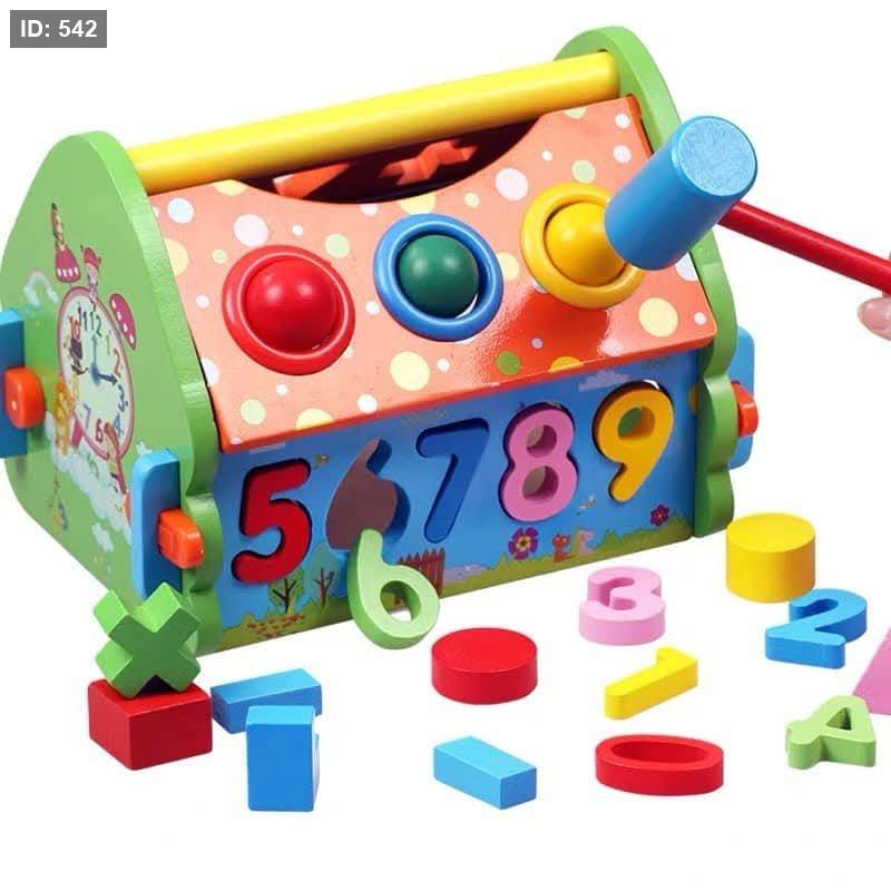 المحتويات: تأتي المجموعة مع منزل خشبي بمقبض، وأشكال هندسية مختلفة، وأرقام ورموز رياضية، ومطرقة طرق صغيرة، وكرات ملونة.