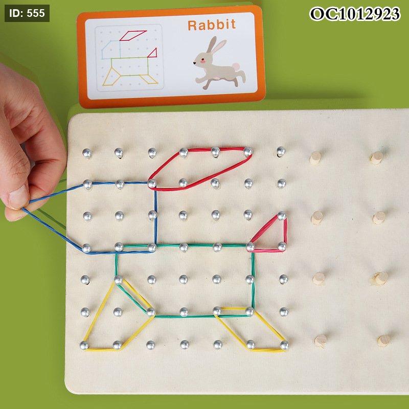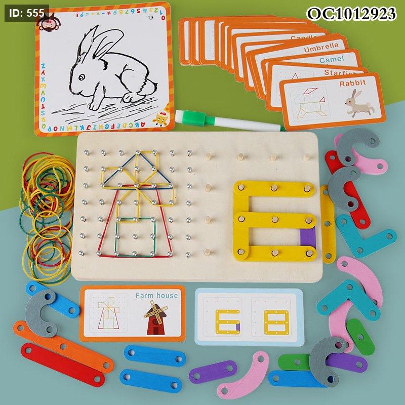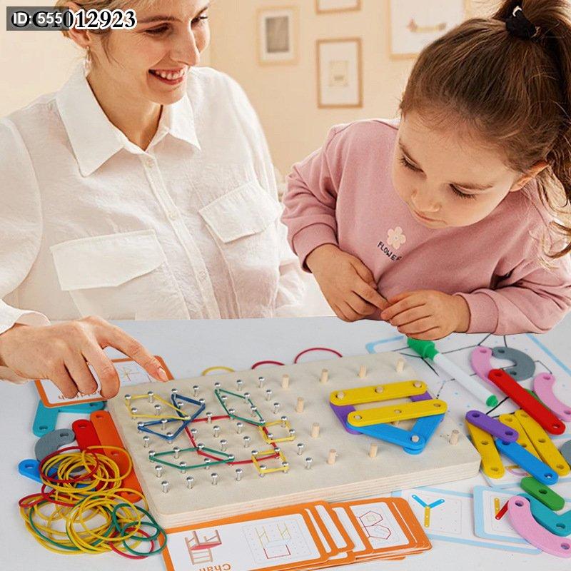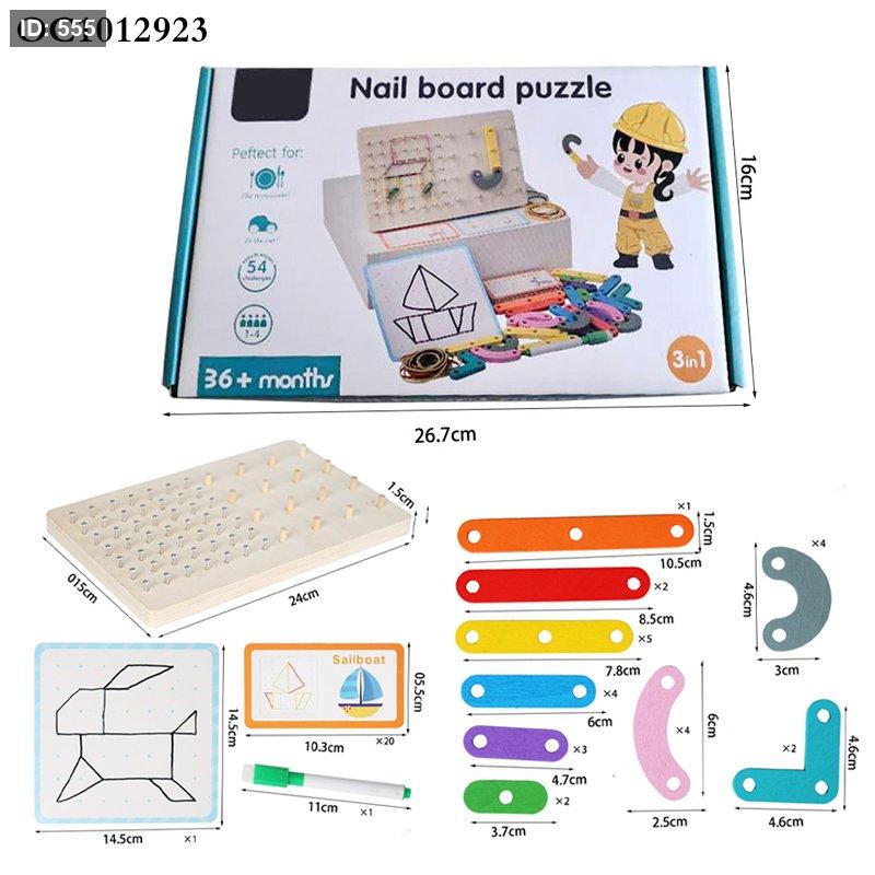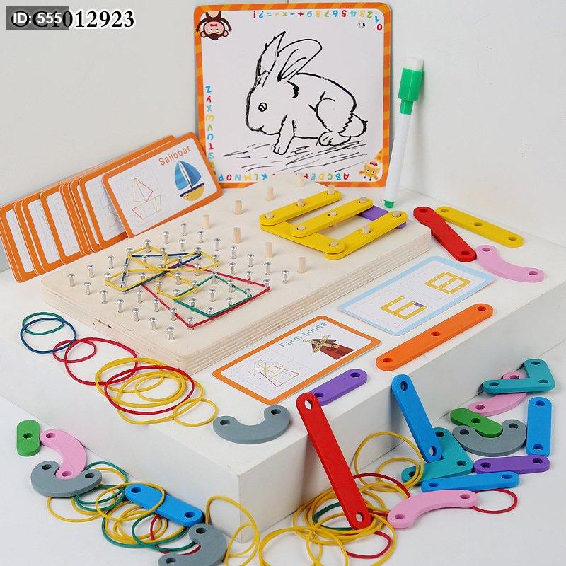 تُعرف اللعبة المعروضة باسم "لغز لوحة المسامير الخشبية Qiyi" (Qiyi Wooden Nail Board Puzzle). إنها لعبة تعليمية ممتعة مصممة للأطفال من سن 36 شهرًا فما فوق، وتأتي مع 54 تحديًا مختلفًا لتشكيل الأنماط باستخدام الأشرطة المطاطية والقطع الخشبية الملونة.