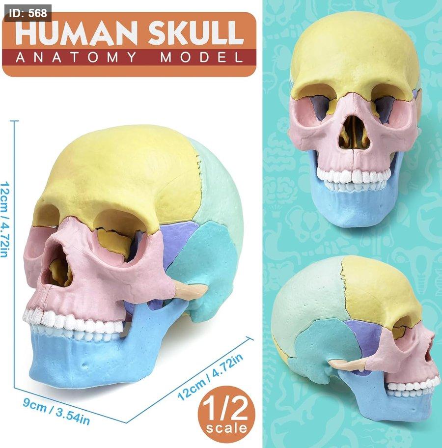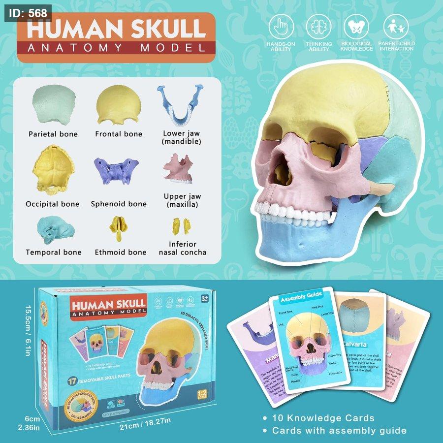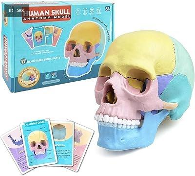 المحتويات: يتكون النموذج من 17 جزءًا قابلاً للإزالة، مما يسمح بتجميعه وفككه لتعلم بنية عظام الجمجمة.