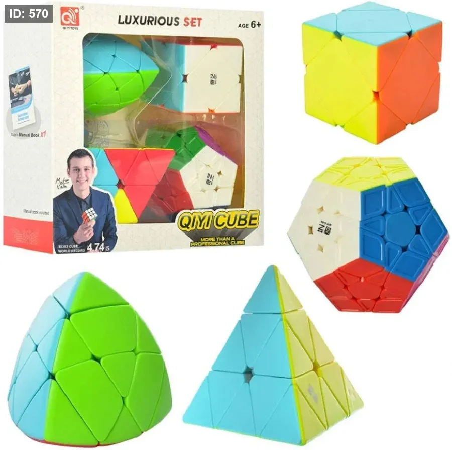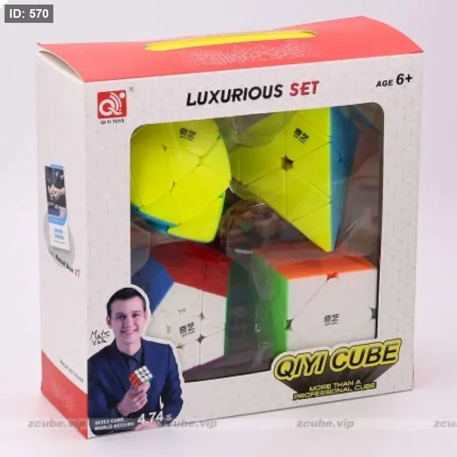 المحتويات: تحتوي المجموعة عادةً على 4 أنواع مختلفة من مكعبات السرعة (Speed Cubes) غير المكعبة الشكل، مثل هرم (Pyraminx)، وMastermorphix، وSkewb، وMegaminx.