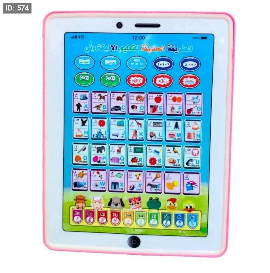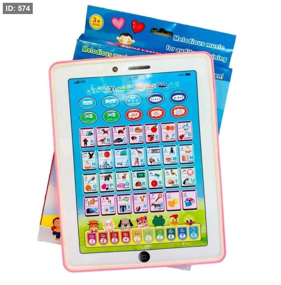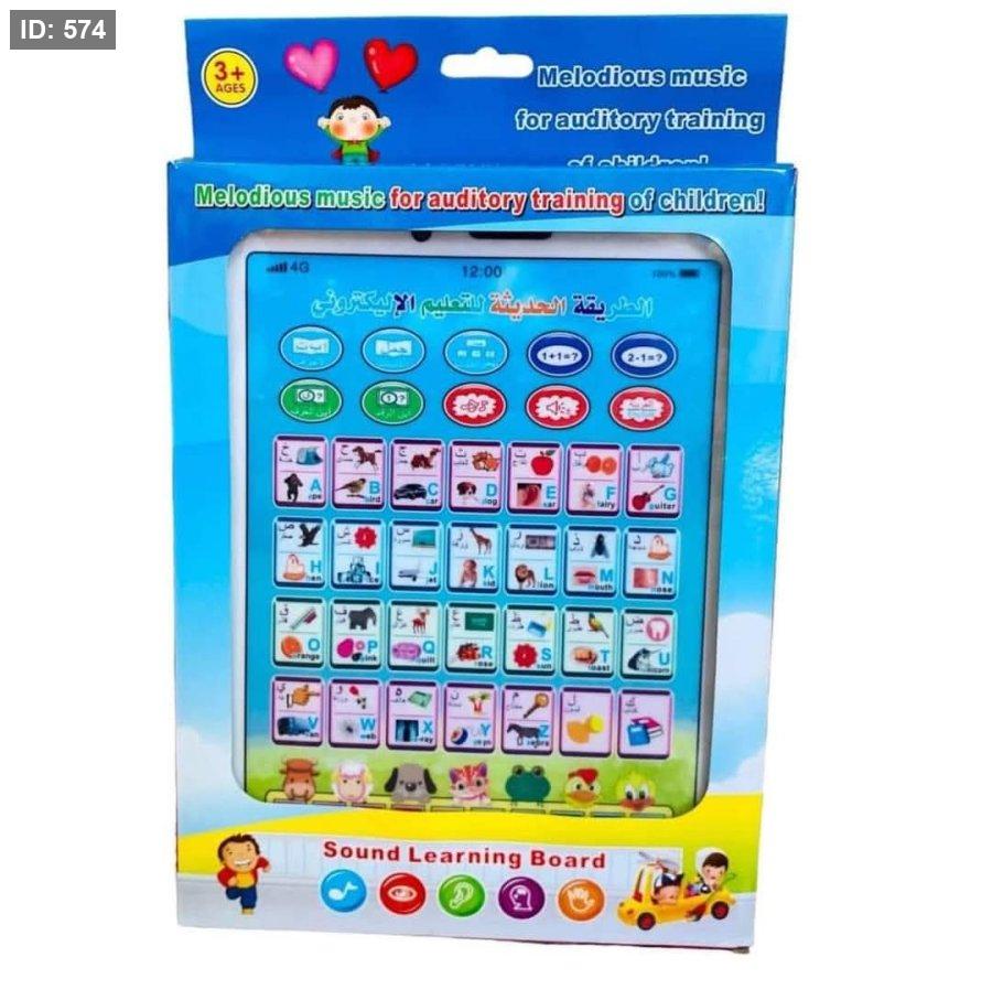 لوحة التعلم الصوتية المعروضة هي لعبة تعليمية إلكترونية مصممة لمساعدة الأطفال على تعلم الحروف الأبجدية والأرقام والكلمات باللغتين العربية والإنجليزية.