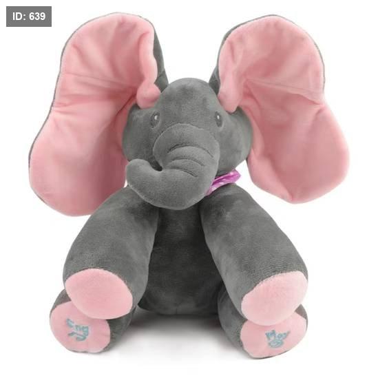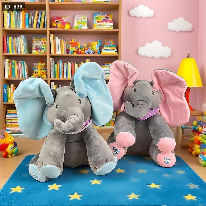 هذا فيل محشو تفاعلي، يُعرف باسم "Peek-A-Boo Singing Elephant".