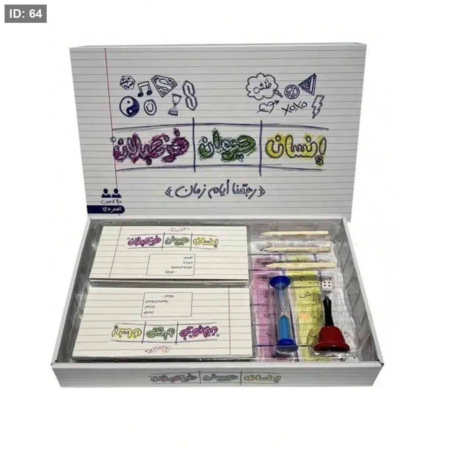 يتضمن صندوق اللعبة ساعة رملية وجرس ونرد وتعليمات لعب مُفصلة.