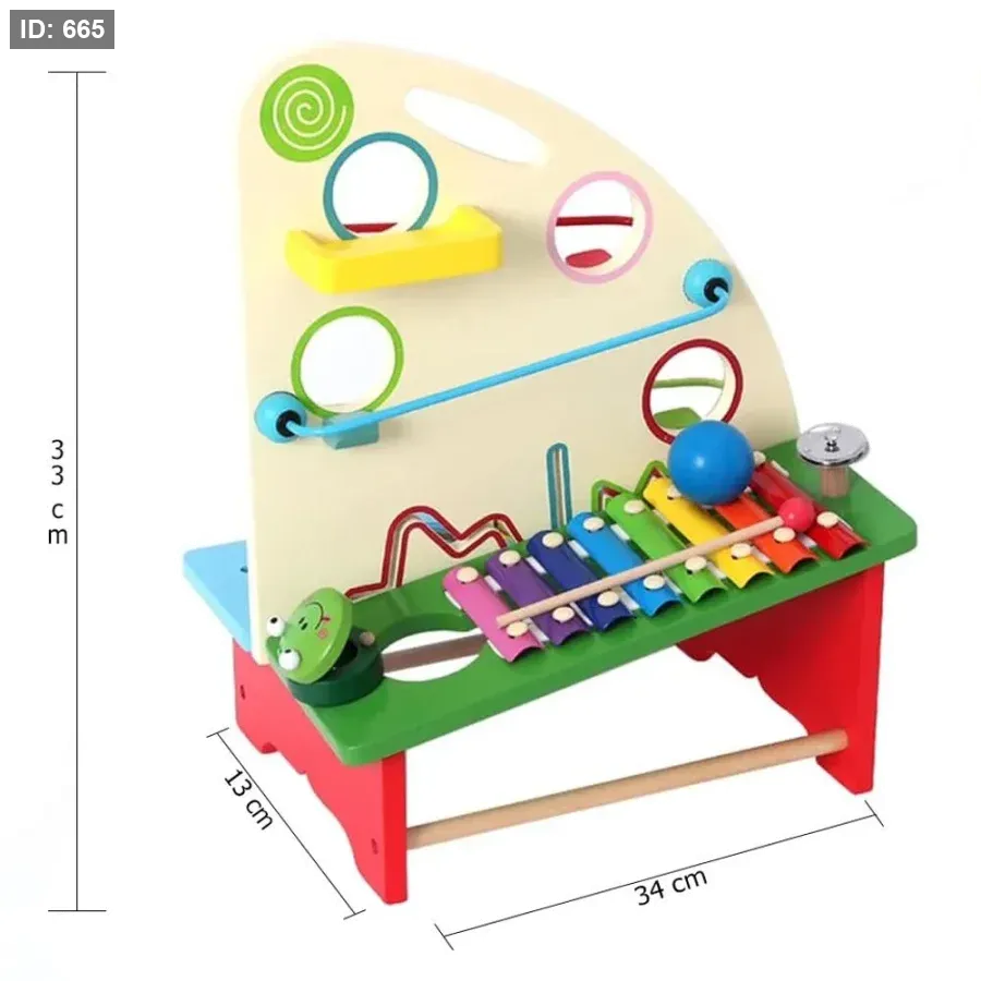 الإكسيليفون (Xylophone): تحتوي اللعبة أيضًا على إكسيليفون خشبي بألوان مختلفة يمكن العزف عليه باستخدام المطرقة المرفقة.