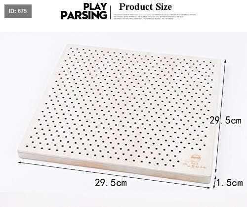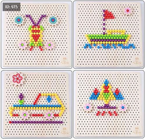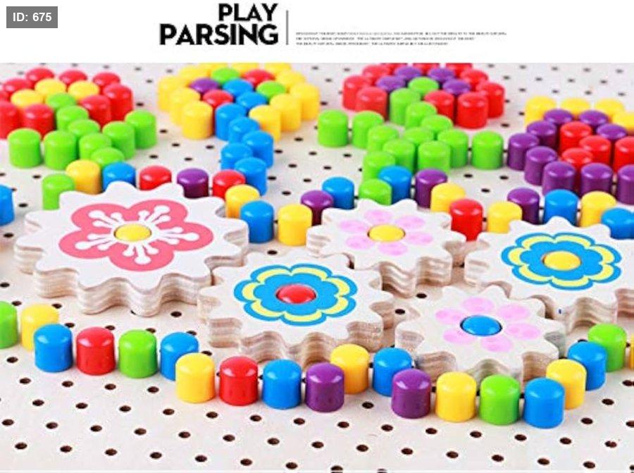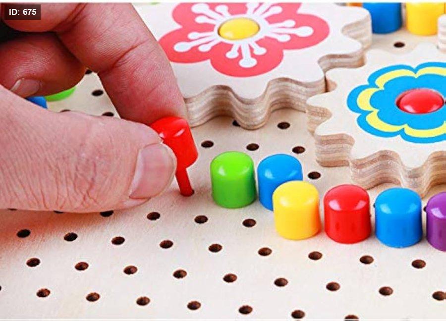 طريقة اللعب: تعتمد اللعبة على قيام الطفل بتثبيت الدبابيس داخل الثقوب الموجودة في القاعدة الخشبية لإنشاء أشكال وأنماط مختلفة، مثلما هو موضح في الصورة بتشكيل الزهور والخطوط.