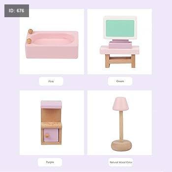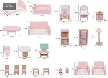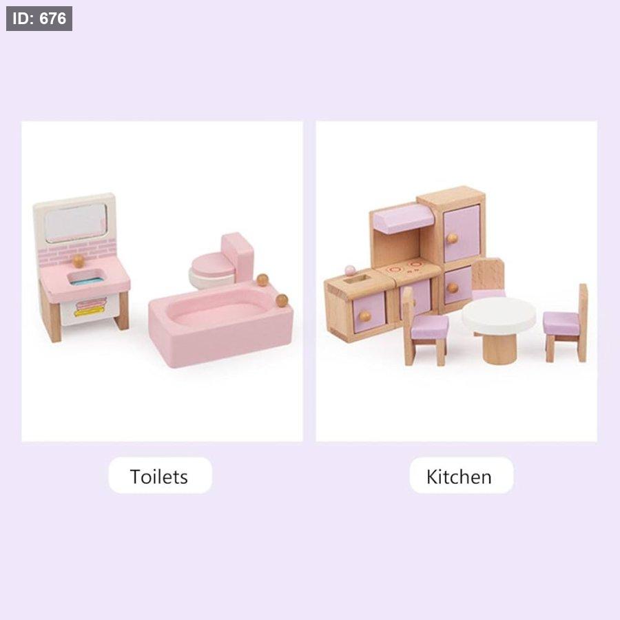 صندوقًا من أثاث الدمى الخشبي المصغر. يحتوي الصندوق على مجموعة من 22 قطعة من أثاث غرفة النوم والمعيشة والحمام والمطبخ باللونين الوردي والبني الفاتح.