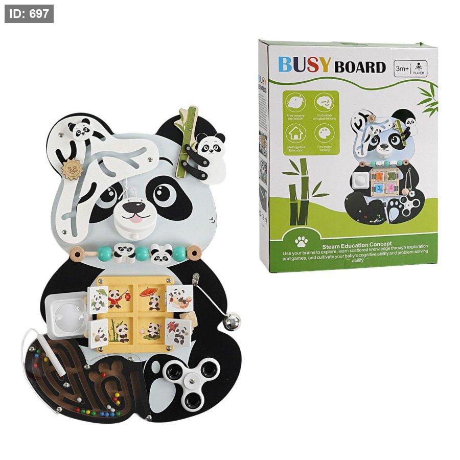 هذه لوحة أنشطة خشبية (Busy Board) بتصميم باندا.