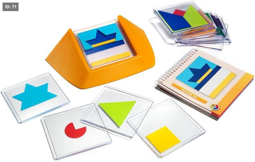 محتويات اللعبة: تتضمن حامل عرض و18 بلاطة شفافة ملونة مختلفة الأشكال، وكتيباً يحتوي على التحديات والحلول.