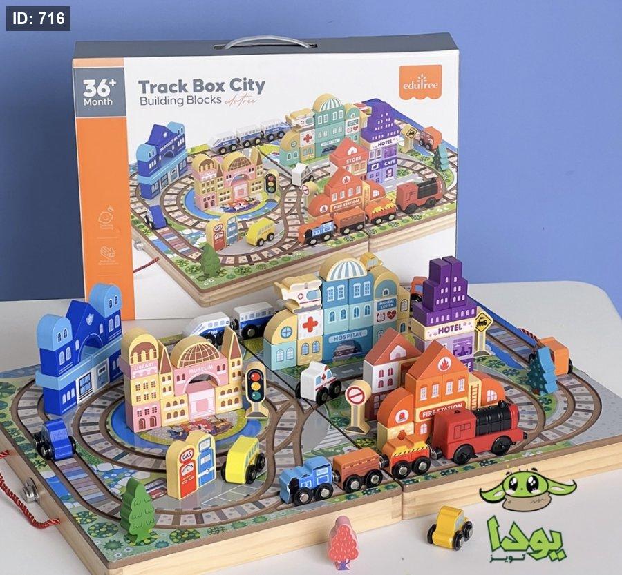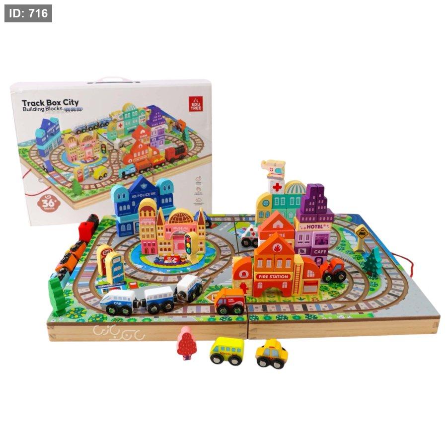 هذا صندوق مسار مدينة (Track Box City)، وهو مجموعة مكعبات بناء خشبية وتعليمية للأطفال. تشمل الميزات الرئيسية ما يلي: