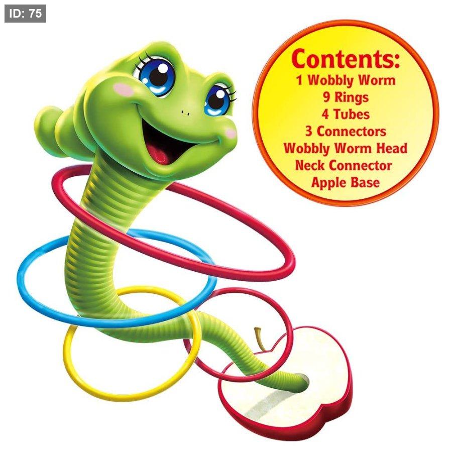 المحتويات: تتضمن عادةً دودة ووبلي واحدة، 9 حلقات بثلاثة أحجام مختلفة لتغيير مستوى الصعوبة، وأنابيب توصيل وقاعدة على شكل تفاحة لتجميعها.