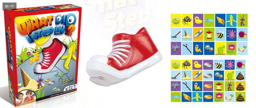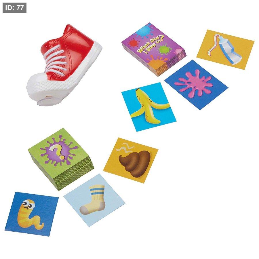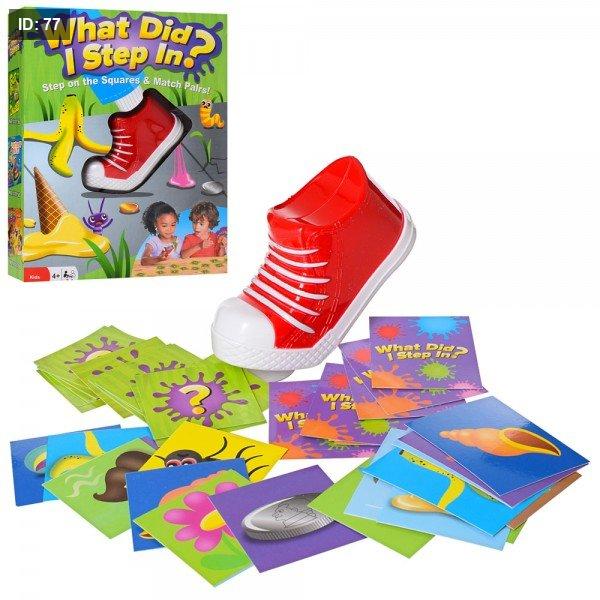 لعبة "What Did I Step In?" هي لعبة ذاكرة مطابقة ممتعة وموجهة للأطفال. تتضمن اللعبة حذاءً بكعب يحتوي على كأس شفط (suction cup) يستخدم لالتقاط البطاقات المقلوبة على الأرض.