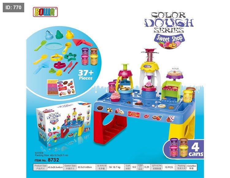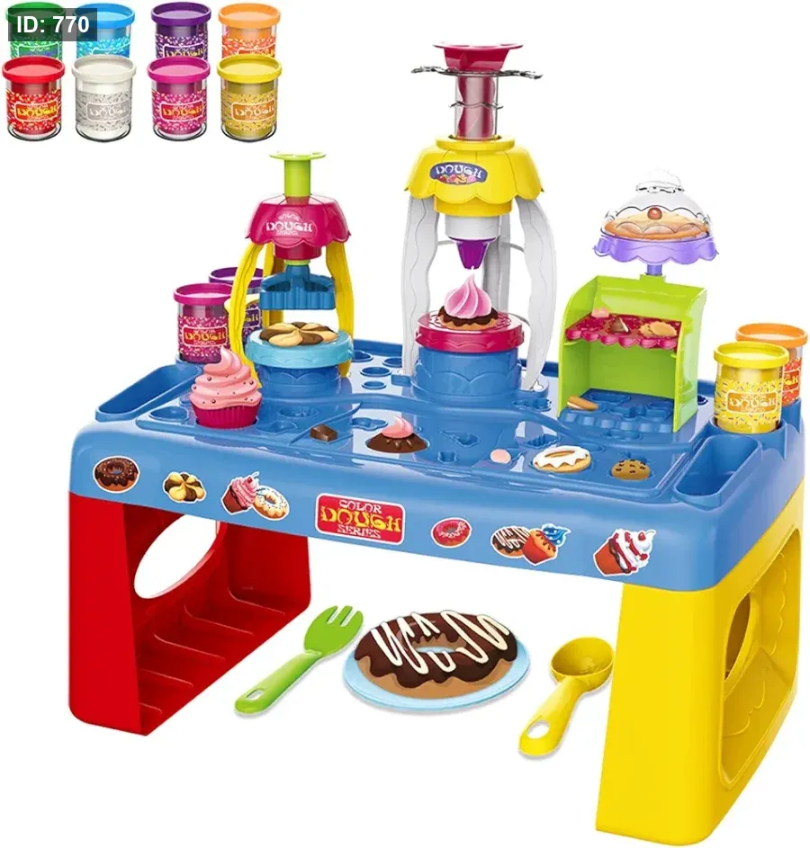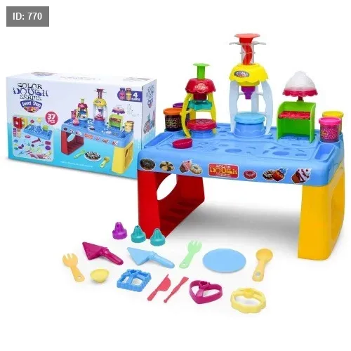 المحتويات: تتضمن المجموعة طاولة لعب، و4 علب من عجين التشكيل الملون غير السام، و37 قطعة من الأدوات والقوالب المختلفة.