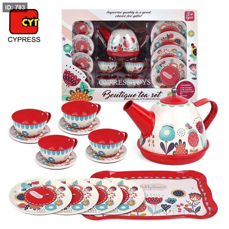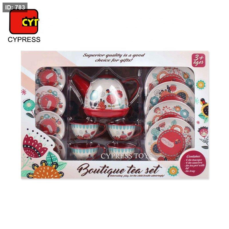 طقم الشاي بوتيك المعروض في الصورة هو لعبة أطفال معدنية تحمل علامة "XIN JIA LE".