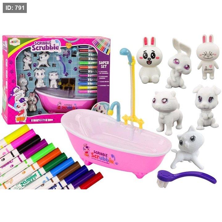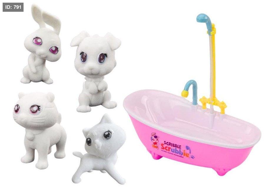 المحتويات: تتضمن هذه المجموعة الكبيرة عادةً 6 شخصيات حيوانات أليفة قابلة للغسل، 12 قلم تحديد فائق النظافة وقابل للغسل، فرشاة فرك واحدة، وحوض استحمام واحد قابل للعمل.