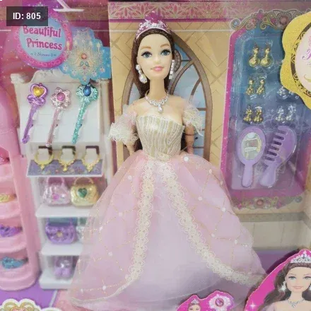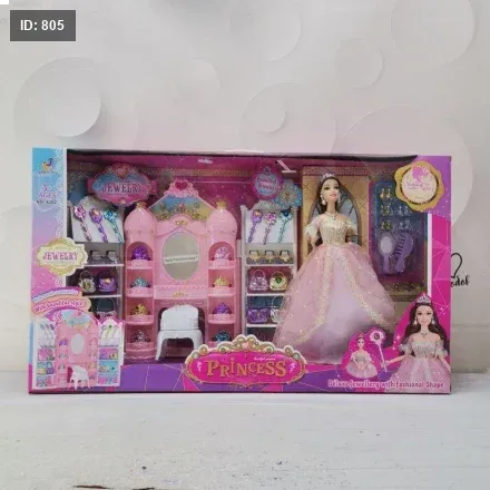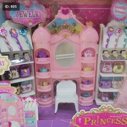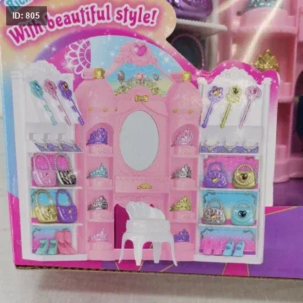 المحتويات: تحتوي المجموعة على دمية ترتدي فستانًا ورديًا طويلًا وستاند على شكل قلعة مع أدراج ورفوف لعرض وتخزين الأكسسوارات مثل التيجان والعقود والأساور وأمشاط الشعر.