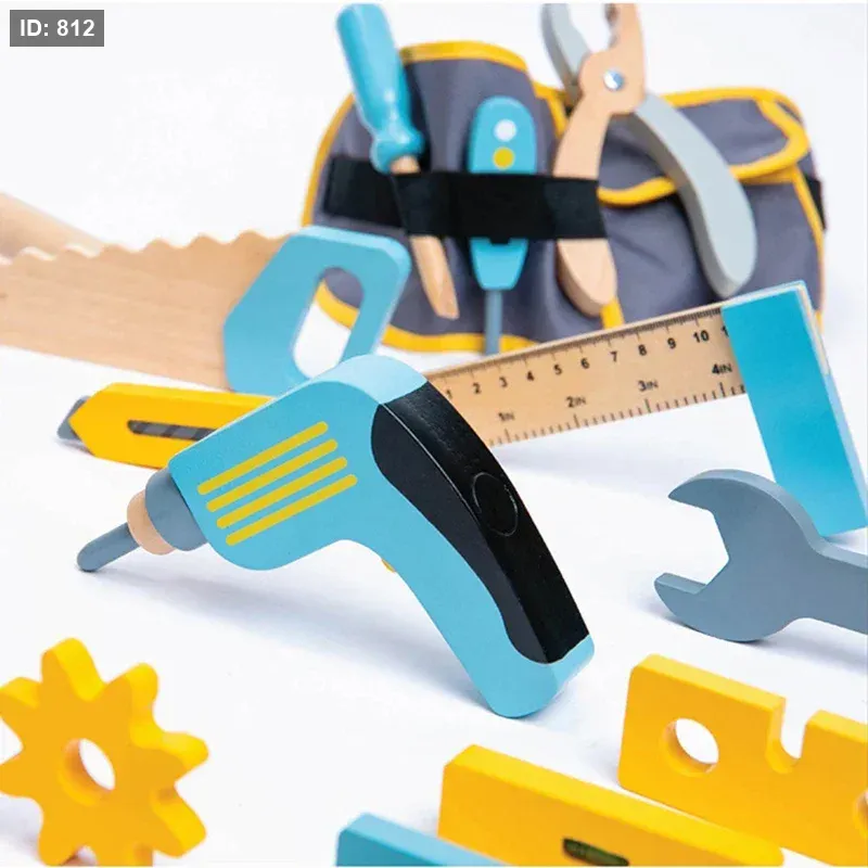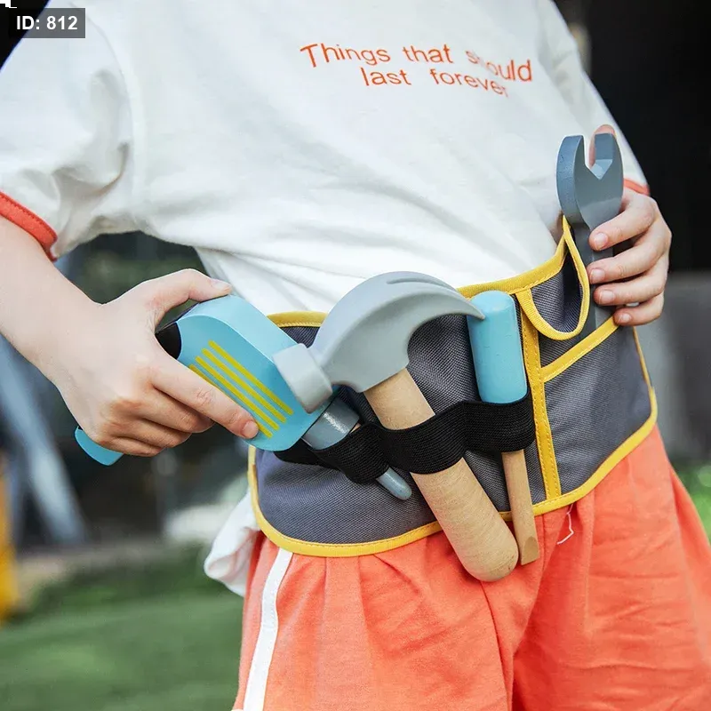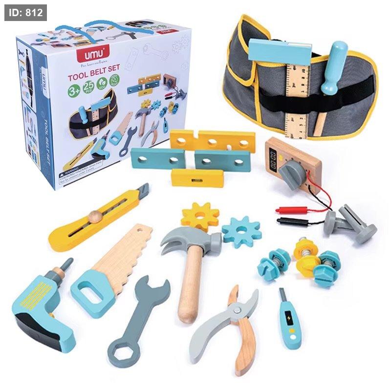 تظهر الصورة مجموعة ألعاب حزام أدوات للأطفال، مصممة للعب والتعلم والاستكشاف. تتضمن المجموعة 25 قطعة من الأدوات الخشبية.