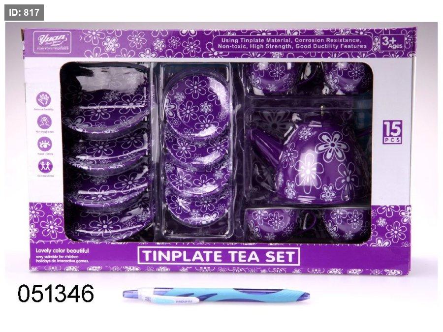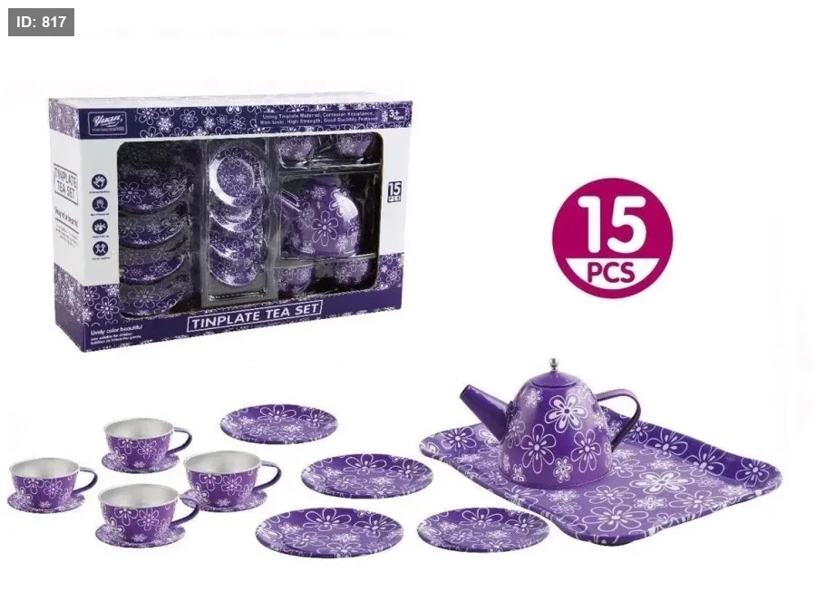 طقم شاي من الصفيح المعروض هو منتج لعبة للأطفال مكون من 15 قطعة، ويتميز بتصميم زهور أرجوانية وبيضاء. يتم تسويق هذه الأطقم غالبًا للأطفال لتشجيع اللعب التخيلي وتنمية المهارات الاجتماعية.