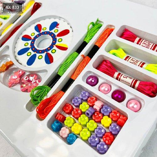 المحتويات: تحتوي المجموعة عادةً على خرزات ملونة، وخيوط، وأدوات الحياكة أو الصنع، وأحيانًا خرزات تحمل أحرفًا أو أشكالاً مثل الزهور والقلوب والفراشات.
