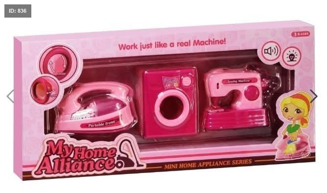 المحتويات: تتضمن المجموعة مكواة محمولة، وغسالة، وماكينة خياطة.