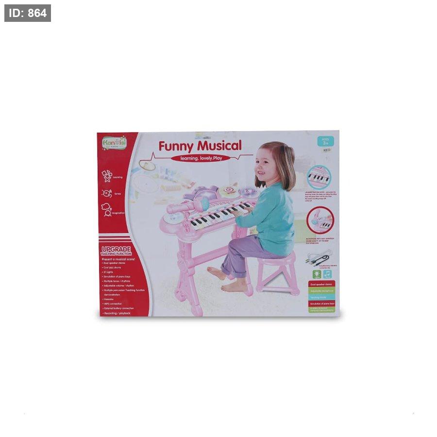 لعبة البيانو الموسيقية للأطفال المعروضة في الصورة هي منتج يسمى "Funny Musical" من إنتاج "Kantisi". إنها لعبة بيانو إلكترونية وردية اللون مصممة لتعليم الأطفال الموسيقى بطريقة ممتعة وتفاعلية.
