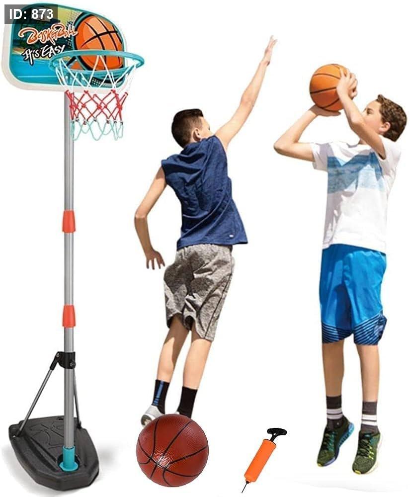 المكونات: تتضمن المجموعة عادةً لوح كرة السلة والشبكة، وحامل قابل للتعديل، وكرة سلة، ومنفاخ هواء [1.1, 1.2].