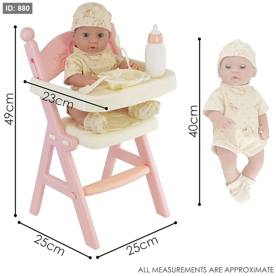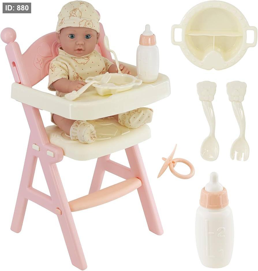 ملحقات متضمنة: يأتي الطقم مع كرسي طعام زهري قابل للطي وبعض أدوات الطعام، مثل الطبق والملعقة والشوك واللهاية والزجاجة، مما يتيح للأطفال محاكاة سيناريوهات الوالدين الحقيقية.