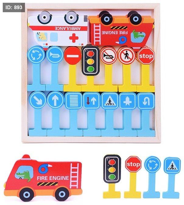 المحتويات: تتضمن المجموعة عادةً مركبات خشبية (مثل سيارة إسعاف وشاحنة إطفاء) وإشارات مرور مختلفة (مثل "توقف"، وإشارة ضوئية، وعلامات اتجاه).