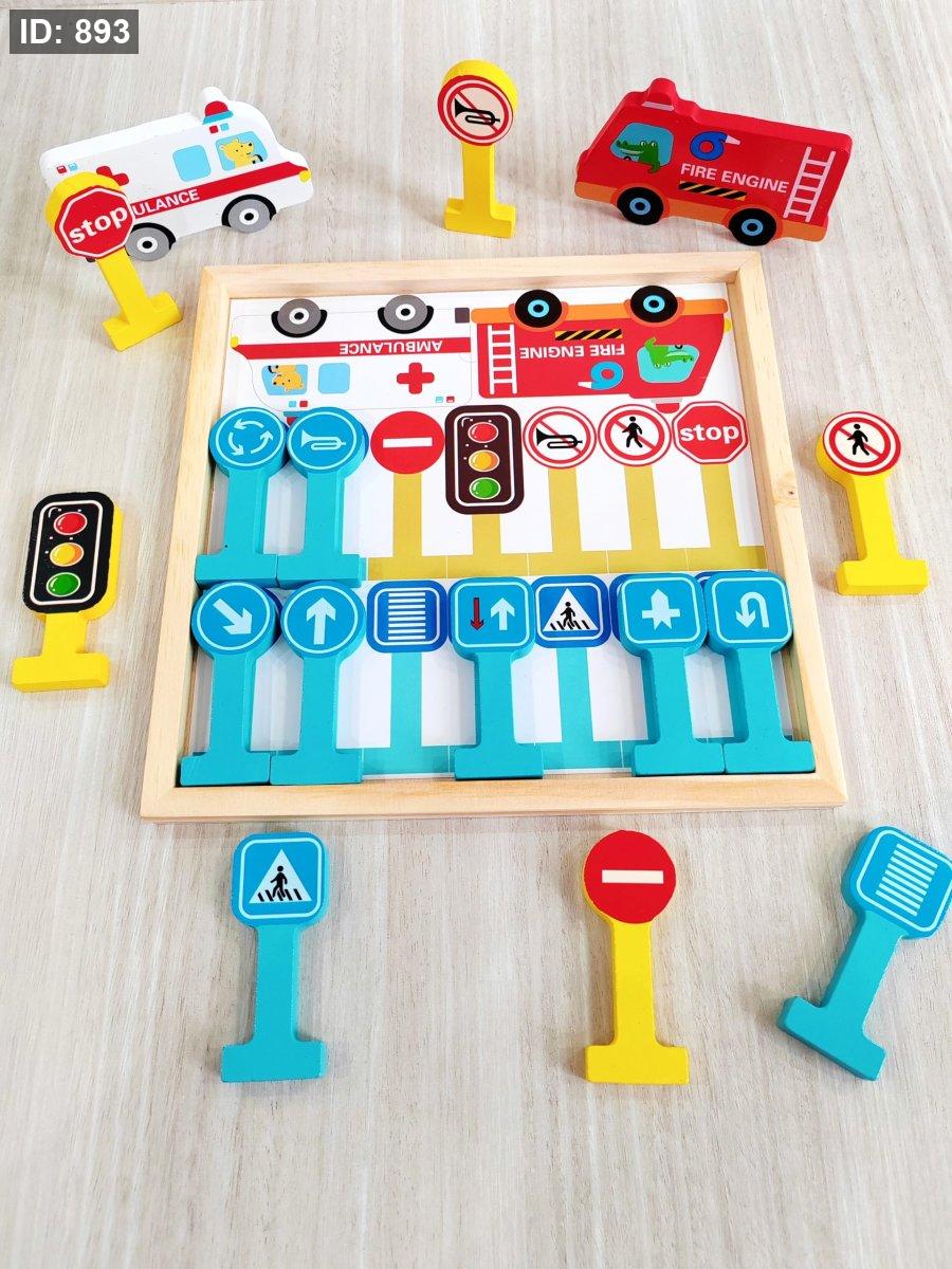 مجموعة ألعاب إشارات مرور ومركبات خشبية تعليمية للأطفال، غالبًا ما تتكون من 15 أو 16 قطعة وتُباع من قبل بائعين مختلفين مثل كابتين و Attatoy. تم تصميم هذه المجموعات لمساعدة الأطفال على تعلم قواعد السلامة المرورية الأساسية وتطوير المهارات الحركية والتفكير المنطقي من خلال اللعب التخيلي.
