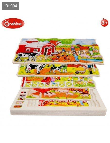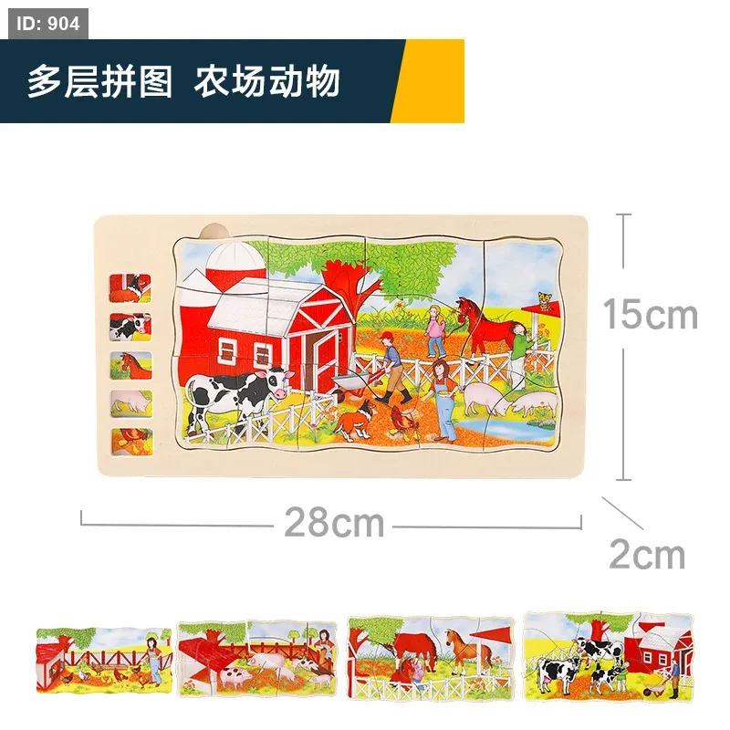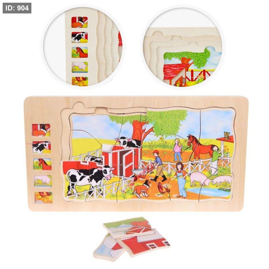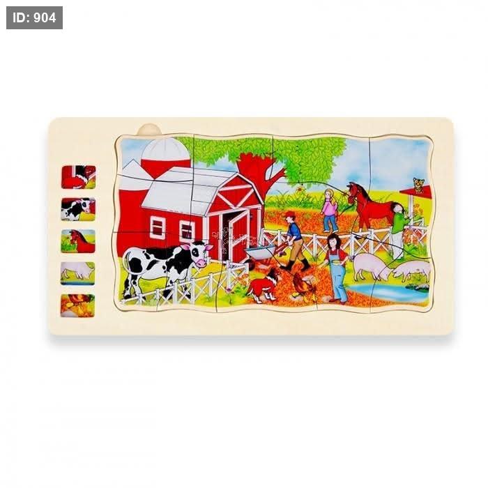 الوصف: اللعبة عبارة عن أحجية خشبية ذات طبقات متعددة تصور حيوانات المزرعة في بيئات مختلفة. كل طبقة تكشف عن جزء مختلف من المشهد أو الحيوانات.