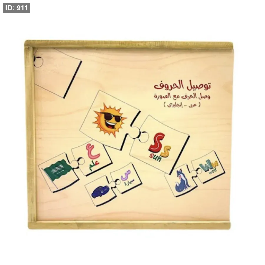 الوصف: هي لعبة ألغاز (بازل) تعليمية مصنوعة من الخشب، مصممة لمساعدة الأطفال على تعلم الحروف العربية والإنجليزية.