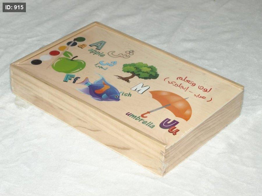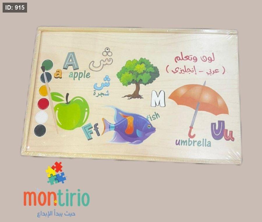 لعبة ألغاز (بزل) تعليمية خشبية لتعليم الحروف الهجائية باللغتين العربية والإنجليزية.