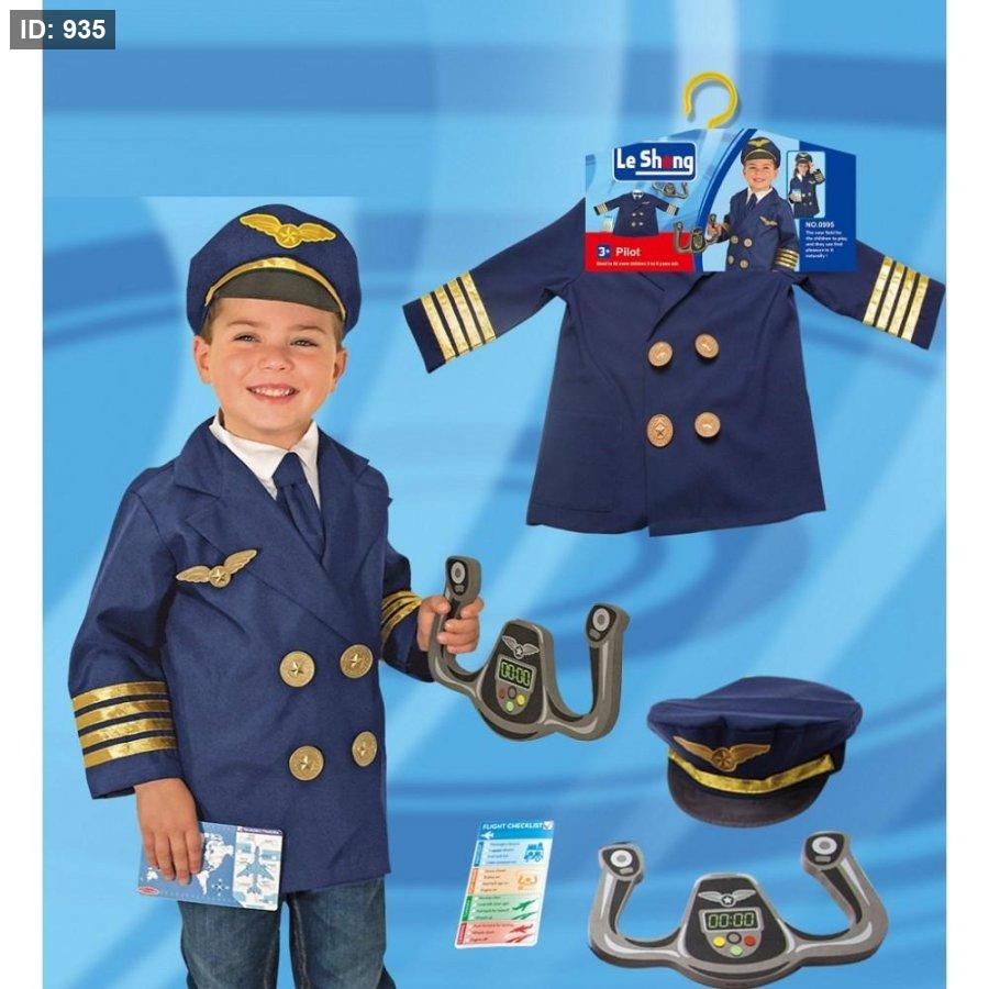 المحتويات: يتضمن الطقم سترة طيار كحلية اللون مع شارات وأزرار ذهبية، وقبعة طيار، بالإضافة إلى مقود طائرة لعبة وملحقات أخرى صغيرة.