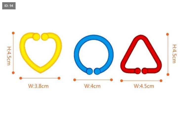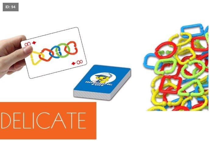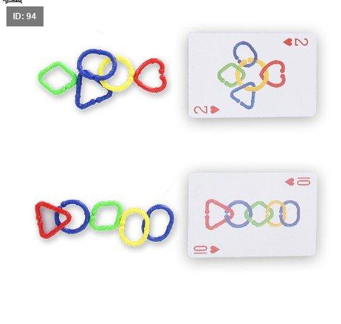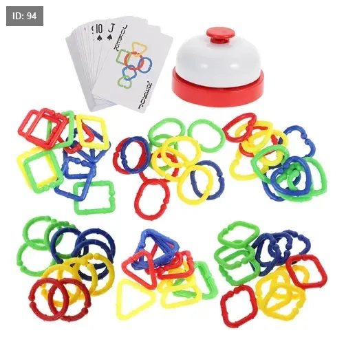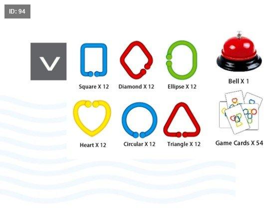 المكونات: تتضمن مجموعة من الحلقات الملونة، وجرس، وبطاقات تحدي مطبوع عليها أنماط مختلفة.