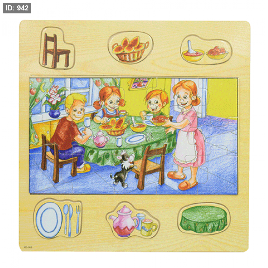 هذا عبارة عن لغز خشبي مركب (بازل) يعرض مشهدًا عائليًا لوقت الطعام، وهو منتج صيني يحمل رقم صنف (ITEM NO: tdnk5).