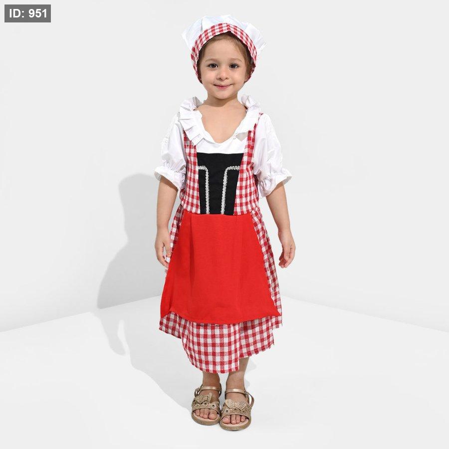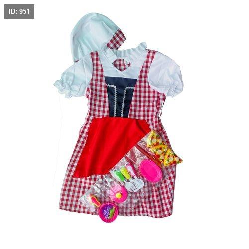 الوصف: يتضمن الطقم فستانًا أحمر وأبيض بنقشة المربعات، وقبعة طاهٍ بيضاء، بالإضافة إلى أدوات مطبخ بلاستيكية للعب التخيلي.
