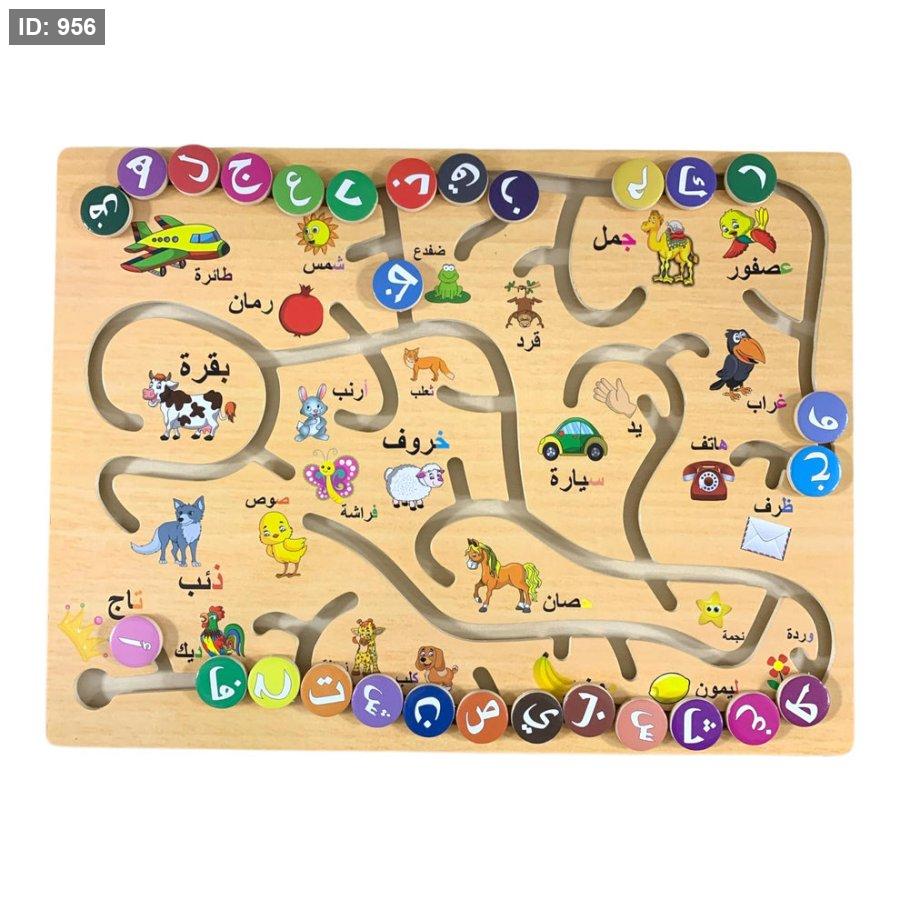 لعبة المتاهة الخشبية المعروضة في الصورة هي أداة تعليمية تهدف إلى تعليم الأطفال الحروف العربية وربطها بالكلمات والصور المناسبة.
