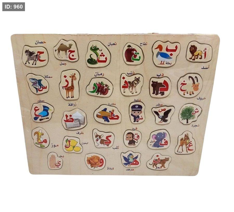 تُظهر الصورة لعبة بازل خشبية تعليمية مصممة لتعليم الأطفال الحروف العربية.